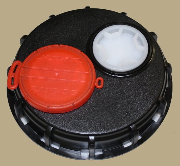 Der IBC Schraubdeckel verfügt über zwei geschlossene Spundstopfen, die eine nachträgliche Montage von Dip-Tube-Systemen (bspw.
